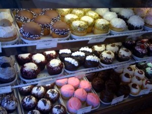 These cupcakes *look* amazing. They are huge and adorable and beg you to ignore how overpriced they are. I must admit, I’ve brought them to parties purely because they make a great presentation. (Though, now that I’ve actually tried them, I promise I won’t be doing that anymore) Thinking of stopping in to treat yourself? Don’t bother. They are sickeningly sweet, even for a serious sugar-freak like myself. The cake is dry and tastes like it came from a supermarket mix. The frosting is too thick, super oily and waaaaaaay too corn syrupy. Some of the cake flavors are filled with a center of flavorless goo. Ew.