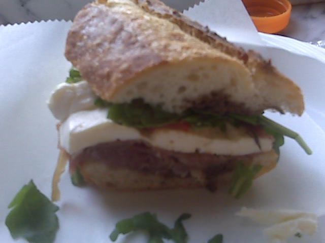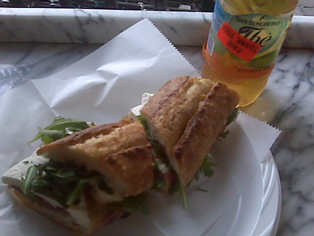 The cafe however, seems to be from another world. The prices are totally reasonable, the service is super fast, and you can always get a seat inside or at the new outside tables. My lunch today was a delicious prosciutto, mozzarella, roasted red pepper, arugula sandwich on amazingly fresh baguette with a balsamic vinaigrette. The ratios of meat to cheese to bread were spot-on and the quality of the ingredients were superb. I had a peach ice tea to drink that was SO fruitylicious- not a chemically note to be found (like some other mainstream brands). This lovely lunch cost me around $8 and was worth every fairly-priced cent. I will definitely stop in more often now that I know what a perfect meal I can get there when time is an issue. It’s only about 2 blocks from my apartment which makes it even better. Almost all of the seats are up against windows which makes for an excellent people watching vantage point. See ya there!