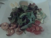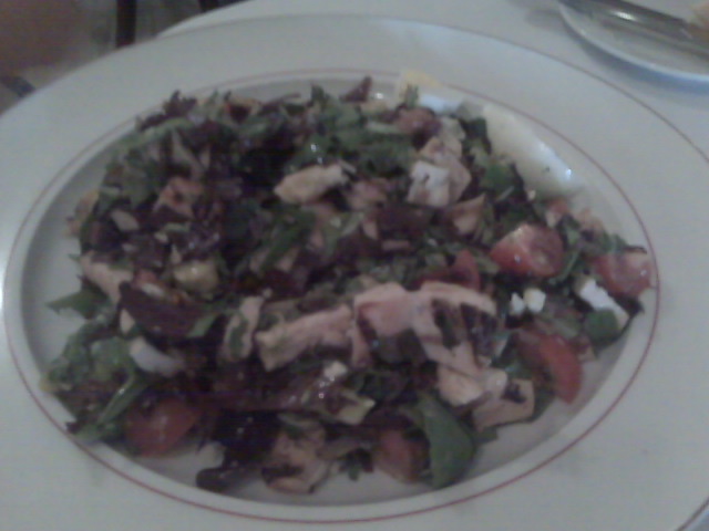To offset our ridiculous saturated fat indulgence, we both chose salads for entrees. My friend had the chopped chicken salad and I had the shrimp Cobb. Now correct me if I’m wrong, but isn’t one of the key elements in a Cobb salad the bleu cheese? Well, pictured below our mac & cheese is the ONE tiny piece of bleu cheese that came with my salad. Ummm. Really? Did this one crumb fall off of another salad or was it deliberately placed there? If the latter, wow that’s pretty f-ing ridiculous. If not, maybe the chef needs to brush up on her key cobb salad ingredients list. By the time the waitress came back to check on us, I had already eaten half the salad and was too full to bother sending it back. She asked if I wanted a side of bleu cheese- but I was already pretty ‘over it’. It was otherwise a pretty poor salad anyway. The dressing was completely boring and not even a little bit original or creative- I’m pretty sure it was just olive oil and lemon. The shrimp were fresh and grilled nicely, but almost inedible they were so over-salted. The tomatoes, given the fact that this is the prime time of year for awesome tomatoes, were very so-so. The bacon was just bad. Chewy thick chunks. Ew. I barely finished half of my entree and was pretty glad we decided to have the appetizer and the yummy bread and butter than came first. So, aside from the fact that my evening run is going to be carb-fueled as if I’m running a marathon and not just a few miles, this lunch was a pretty huge waste of time and money. (Although It was a real pleasure to catch up with a friend I hadn’t seen in a while) All in all, it was such a disappointment that I didn’t even bother considering dessert…and for me and my sweet tooth, that says a lot.