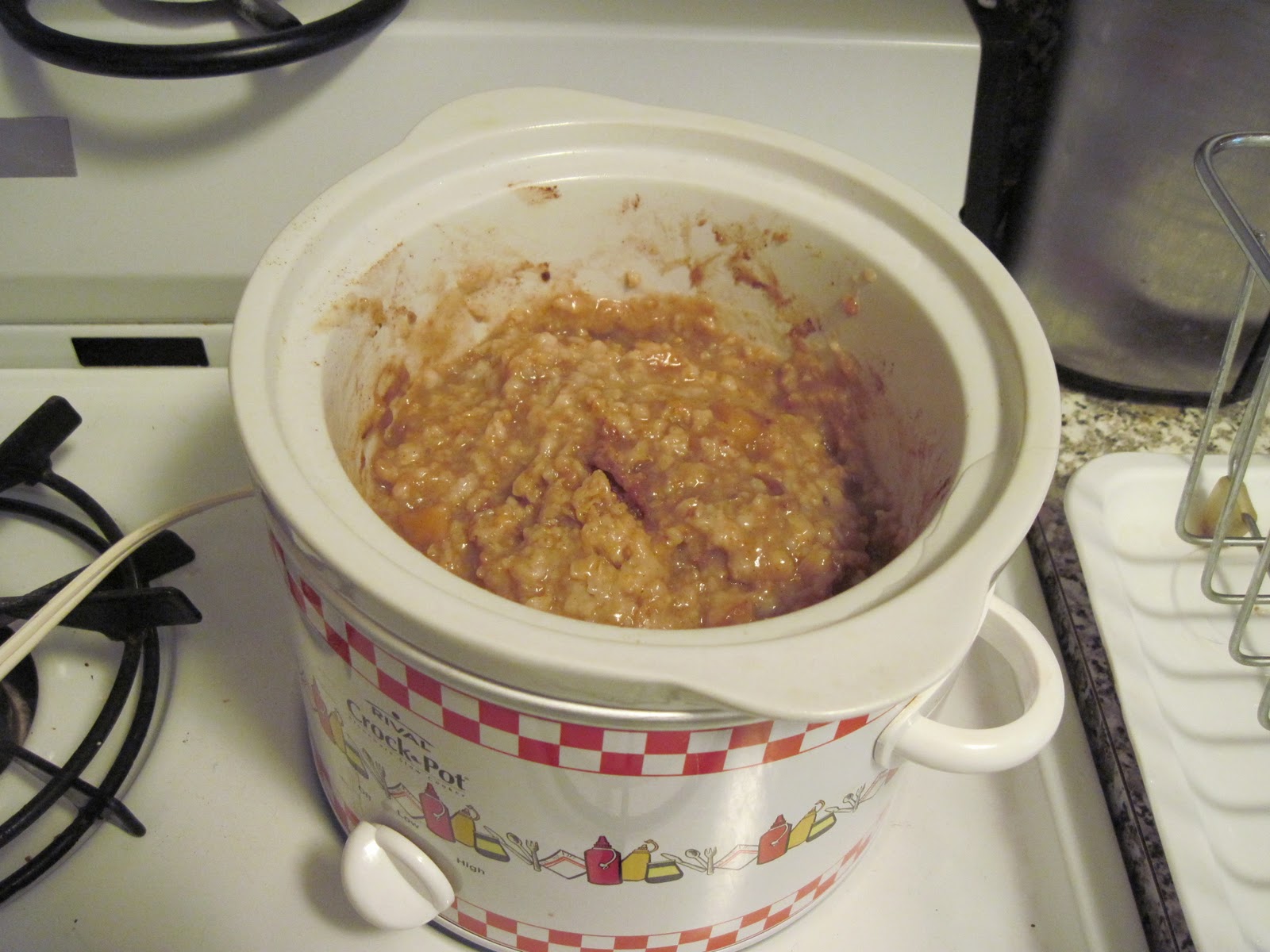 favorite brand. I also like Silver Palette rough cut oats when I can’t find McCanns, although it seems to have caught on and most grocery stores carry it now. This recipe, like most of mine, is merely a concept. Nothing strict about it. It actually takes a little practice to get the right ratio of liquid in there- my first attempt a few years ago turned out to be a burnt-to-a-crisp, stuck-on mess. Thus, the importance of spraying the inside of the crock pot generously with Pam before adding the ingredients. Here’s the concept.