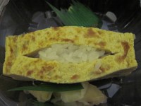 Tamago is one of my favorite Japanese treats- an egg omelette stuffed with rice, and when I took sushi classes, one of the unexpected pieces of information I walked away with is that one criteria you can judge a great sushi chef by is how well the tamago is made. Is should be pale yellow throughout with no brown. Soft and custardy, light but with a tofu-like firmness to it. You should be able to just barely make out the fine, parallel lines of the omelette’s many folds. Unfortunately, this one was way too thick, too fluffy, brown-spots throughout and not dense enough. It was, however, the only thing I wasn’t impressed with.