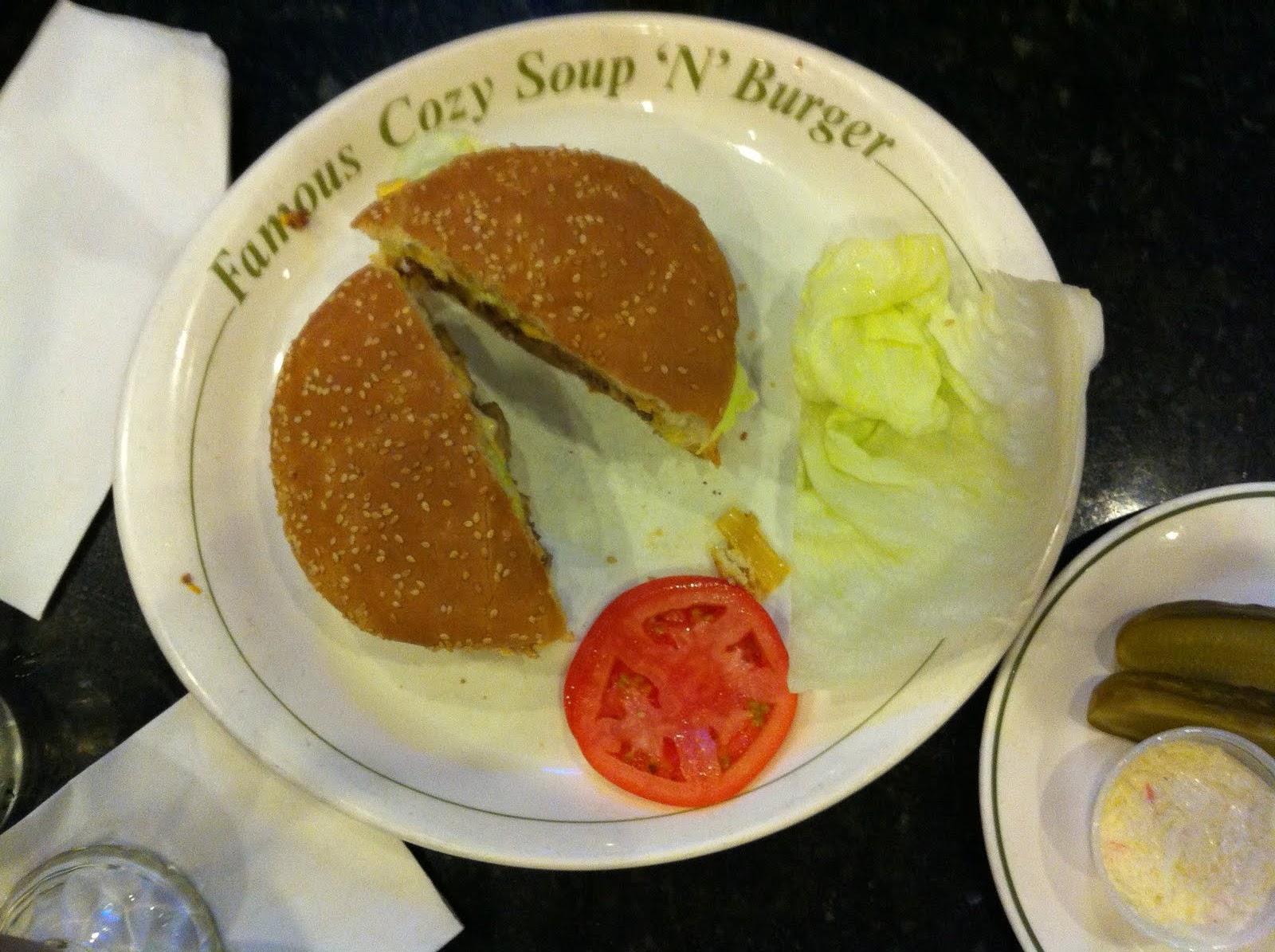 >What better way to replenish iron levels after blood donation than indulging in a ridiculously large burger?? None that I know of. I love a good burger. I probably eat one every 2 months or so and looked forward to this for a couple of weeks knowing it was coming. The burger menu at Cozy’s is an entire page long. Burgers with just about everything you can think of on them. I decided to go for their signature burger with cheddar, fried onions and mushrooms and Mmmm, good choice. Although I ordered it ‘medium’ it came out closer to well done, but that was just fine by me. Smothered in cheese and toppings, it was basically just a melty, delicious pile of more protein, carbs and fat than one person should really ever consume in one sitting….but ohhhhh so worth it. I figured at that point, I may as well have the classic chocolate egg cream that compliments such an overdo, and compliment it did. So chocolatey good and creamy. To amuse myself, I ordered a side salad instead of the french fries that would have made this a ‘deluxe’ platter. Making the healthy choice at this point is pretty much laughable. That said, I did taste the fries and thought they were kind of undercooked and mushy. I didn’t miss out on those at all.