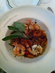 For our entrees we shared the basil linguine with shrimp, vegetables and tomato sauce, and the potato crusted salmon with haricot verts and morels (my FAVORITE kind of mushroom). The pasta really did taste like basil and was a pleasant, light green color. It was clearly homemade and cooked perfectly al dente. The shrimp were large, fresh, cooked perfectly and of excellent quality. The vegetable and tomato sauce were light and summer-y, but in my opinion, weren’t really the best compliments for the shrimp and pasta. I would have preferred a broth or herb sauce instead of the tomato. The salmon, though it was slightly over-cooked instead of rare in the center as salmon really should be, was beautifully presented with a spiral of slivered, golden potatoes on top. The haricot verts and morels were wonderful, and I enjoyed them more than the star of the plate.