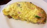 Our meals came out soon after and my omelette was HUGE. I had the farmer’s omelette stuffed with peppers, zucchini, mushrooms, ham and cheese (both of which I asked them to go light on and still got plenty). I am pretty sure that was at least a 5 egg omelette – it was so thick and covered my plate. I was stuffed after a bit less than half and happily had it boxed up to go home. It will make a great breakfast tomorrow after I re-saute it for a few minutes to heat it back up. Gabriel’s shrimp, asparagus and Monterey Jack was quite delicious. The shrimp were large and cooked perfectly and nicely complemented by the other ingredients much to my surprise. His pancakes were fluffy and beautiful and dusted with a little confectioner’s sugar. They were so tasty that they really didn’t even need maple syrup on top. His home fries were crunchy and delicious and I’m glad he had ordered them so I could at least have tastes.