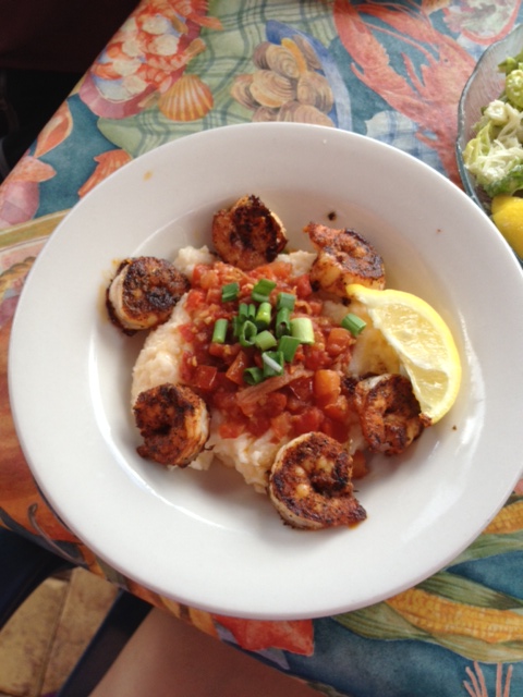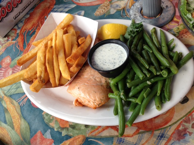 So, a couple of months later, the opportunity to go back presented itself when we were in that neighborhood again. We took a deep breath, parked in the lot with as open a mind as possible, and asked for a table outside. We were led to the side of the building and a choice table facing the lake. It was a gorgeous day, with a lovely view and already this experience was way better than the first. A very friendly waitress named Delilah told us the specials, and her description of the grilled shrimp with cheesy grits sounded too good to pass up. We ordered that to start with, plus a Caesar salad, and salmon with dill sauce, french fries and green beans. The app came out fast and looked amazing. The grits were ok but the shrimp were incredibly salted. Gabriel agreed, but ate them anyway, but I really couldn’t manage them. I worried that this meal was going to be worse than the first. The salad and the salmon, thankfully, were actually very good. The dressing was homemade and just fishy enough, the salmon was fresh, cooked well and it’s dill sauce was creamy and delicious. The green beans were fresh and not overcooked- there is nothing worse than mushy green beans, and the fries- like last time, were great. The view definitely made everything taste a little better, and the avoidance of the inside of the restaurant helped to change the feel of our experience to a more positive one.