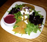 Gabriel and I went in for a late night dinner after yoga class when there’s not much open and restaurant choices are limited. We were seated right away and given our Ipad to browse through. After scanning through pages of options for small, sharing plates, we decided to ask our waitress for some suggestions and advice. She told us that the flatbreads, salads and a few other dishes were the standouts, and that we should start with one or 2 two plates with intent to order more as we went along. We took her advice and started with the Grilled Lemon Chicken & Artichoke flatbread with arugula and parmesan (deliciously chewy, crisp and full of flavor.  I especially liked the candied lemon peel on top) as well as the Red & Yellow Roasted Beets with goat cheese, watercress, arugula, toasted pistachios and a vinaigrette on the side. I adore beets, so this was an obvious pick, and it didn’t disappoint at all. The roasted beets were slightly sweet, not over-cooked at all, and beautifully colorful with the greens. The combo of lettuces and nuts with the cheese and beets was wonderful- both in their flavor and texture.