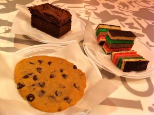 I would have strongly preferred busting open a box of Entenmann’s, or even <shudder> Chips Ahoy, over this miserable excuse for a chocolate chip cookie. Under-cooked, and not in the good doughy way, this was just a total waste of calories. The rainbow cakes were so stale and dry that I could literally peel the ‘jelly’ layer off in one rubbery strip. I’ve had better at bad Bar Mitzvah dessert buffets. The brownie was crumbly, dry, and chemically. It honestly couldn’t hold a torch to a brownie sold at an elementary school bake sale that was made three nights before from a Duncan Hines mix by a couple of 8 year olds.