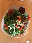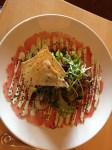 We arrived to a very short waiting time, and were seated in about 10 minutes in an awesome spot. The atmosphere here is very cool. It’s like a mythical cavern with fountains, waterfalls, and a great view of the lake and the park. Our waiter was very attentive right from the start, and having been informed by Gabriel that we were newlygaged, offered us each a glass of wine on the house. Awesome! He also brought some warm bread and butter over to us and told us about some delicious sounding specials. Being that it was lunch time on a hot day, we both skipped the rich/heavy specials and ordered salads.