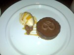 The dessert course, as is often the case, redeemed the meal’s shortcomings. We were given a molten chocolate cake for the middle of the table (presumably because of my fish-complaint) and it was delicious. Crusty outer layer and hot, melty, rich interior. A perfect scoop of vanilla bean ice cream sat alongside it making for a lovely presentation. I will never tire of molten chocolate for dessert, passe as it may be. We also shared the chocolate mousse with pear compote and hazelnut ice cream. It came enrobed in a dark chocolate ganache layer and the inside was creamy and decadent, with the pears as a lovely unexpected touch. Finally, I moved on to the butterscotch gateaux with marscapone and devil’s food. YUM. It had little crispy bits on the cake and it was impossible to not finish it in 30 seconds flat. By then, even though we were totally stuffed but the waiter came by with little buckets of mini Madeleines and we managed to make a little bit more tummy space for them. Worth every confectioner’s sugar topped bite.